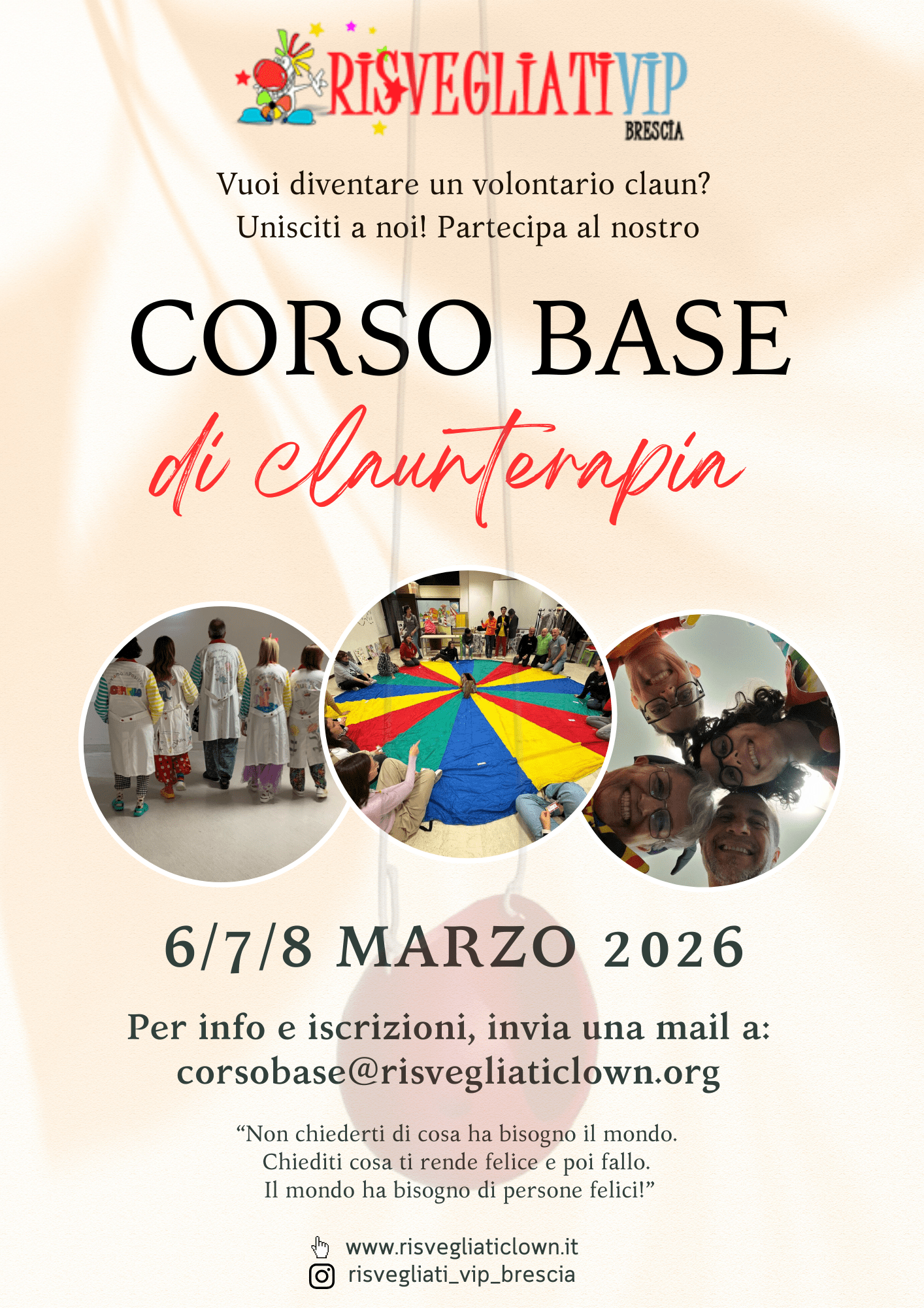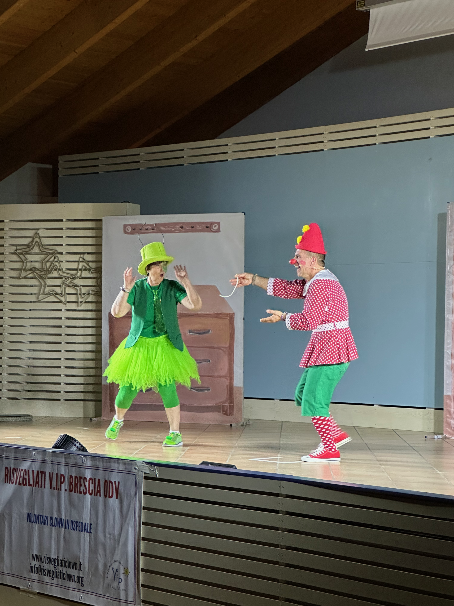 Siamo i Risvegliati VIP Brescia ODV, un’Associazione di volontariato dedicata alla clownterapia che opera con passione nel territorio bresciano dal maggio del 2002. Il nostro nome racchiude la nostra missione più profonda: VIP significa infatti “ViviamoInPositivo”, un impegno quotidiano a trasformare il dolore in sorriso e a diffondere l’ottimismo. Nati come un piccolo gruppo, siamo cresciuti con costanza fino a diventare oggi una solida realtà che conta circa 100 associati. Il nostro impegno non si ferma però alla provincia di Brescia; siamo infatti soci della Federazione VIP Italia ODV insieme a numerose realtà di volontari sparse in tutta la penisola. Grazie a questa grande rete, collaboriamo attivamente per realizzare importanti progetti di solidarietà che portano il nostro messaggio di positività su tutto il territorio nazionale ed estero.